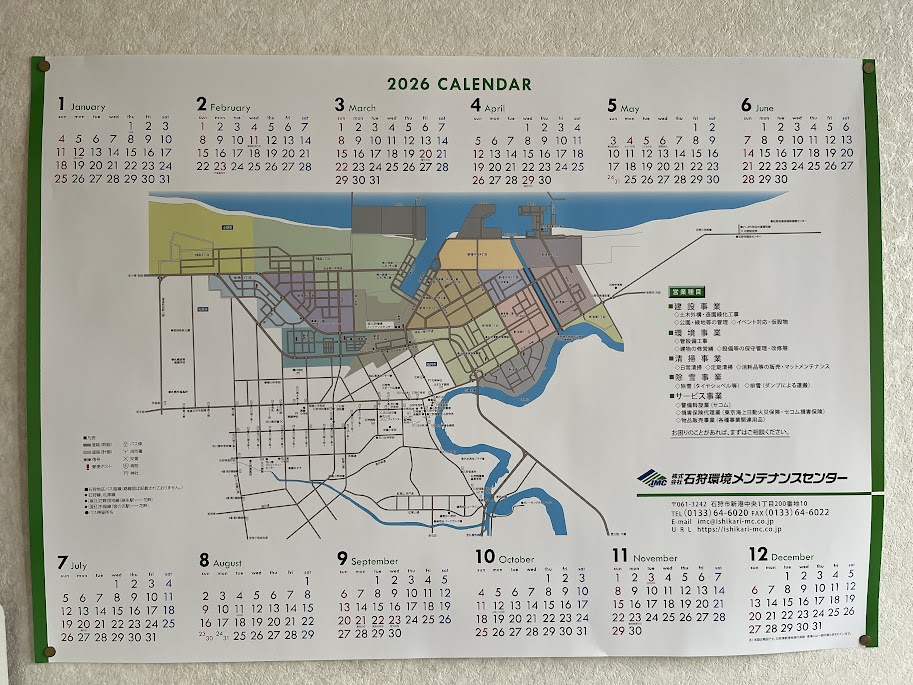 Home > 新着情報 > トピックス > 2026年度カレンダーできました 2026年度カレンダーできました 2025年11月26日 石狩湾新港地域の地図が描かれた2026年度版のカレンダーができました。 会社事務所入口にご用意あります。お立ち寄りの際はどうぞお持ち帰りください。 2025年11月26日 新着一覧へ